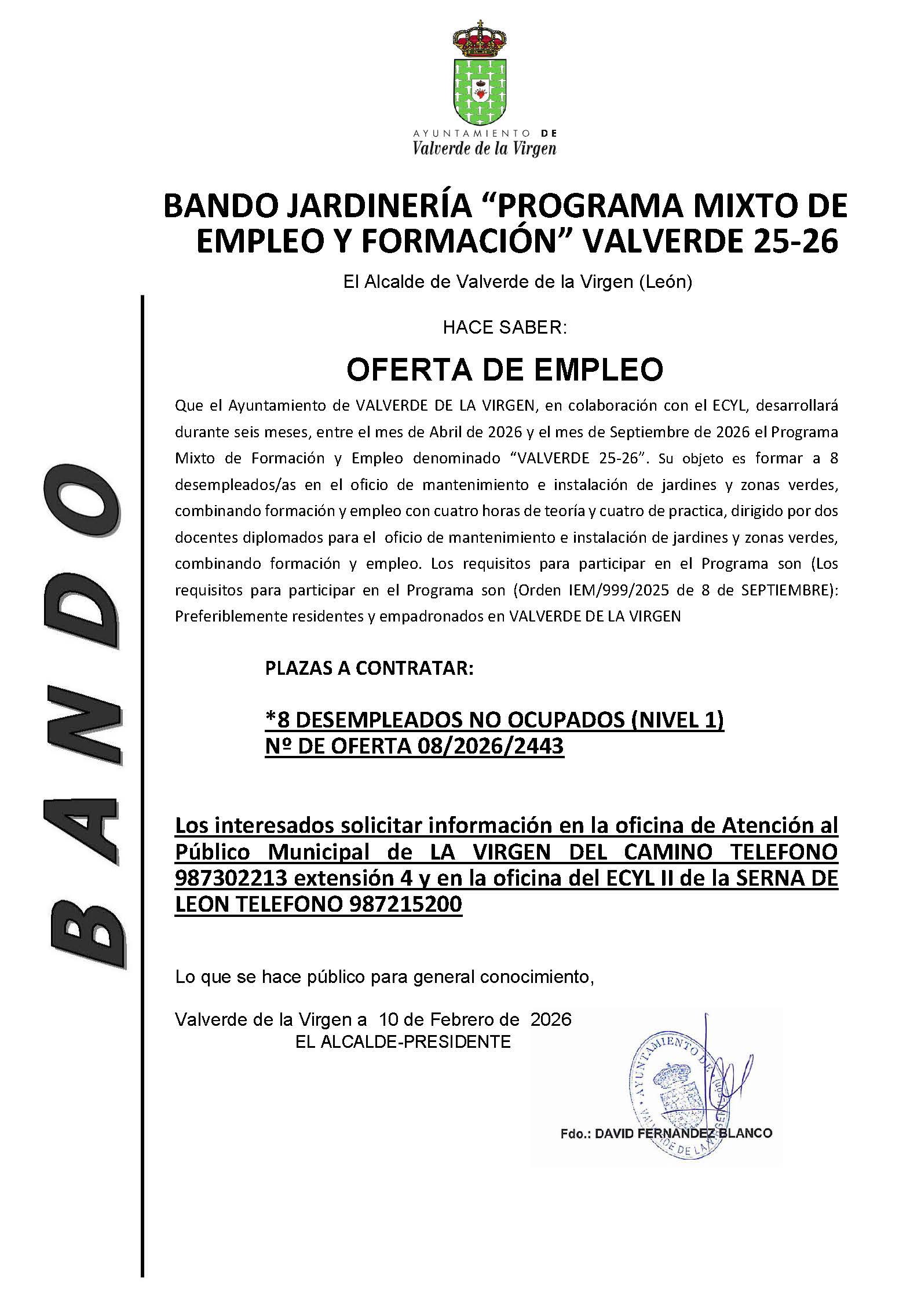 Que el Ayuntamiento de VALVERDE DE LA VIRGEN, en colaboración con el ECYL, desarrollará durante seis meses, entre el mes de Abril de 2026 y el mes de Septiembre de 2026 el Programa Mixto de Formación y Empleo denominado “VALVERDE 25-26”. Su objeto es formar a 8 desempleados/as en el oficio de mantenimiento e instalación de jardines y zonas verdes, combinando formación y empleo con cuatro horas de teoría y cuatro de practica, dirigido por dos docentes diplomados para el oficio de mantenimiento e instalación de jardines y zonas verdes, combinando formación y empleo. Los requisitos para participar en el Programa son (Los requisitos para participar en el Programa son (Orden IEM/999/2025 de 8 de SEPTIEMBRE): Preferiblemente residentes y empadronados en VALVERDE DE LA VIRGEN